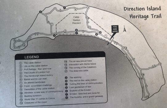 ▲ It can take a couple of hours to walk the three km history trail around Direction Island, a bit longer if you walk right along the seaward side of the island. That’s rocky and takes you by lots (and I do mean lots) of plastic flotsam plus quite a few bits of crumbling cable station foundations, brickwork and metal machinery. The history trail is somewhat difficult to follow at times, I bet very few visitors get to the final handful of panels at the western end of the island. On the beach there are lots of hermit crabs as well. As well as the cable station history there is more on the island’s WW II history when Catalina flying boats used to land here.