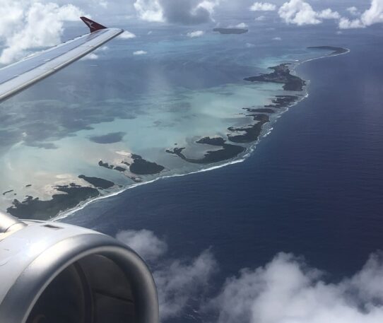 ▲ Departing Cocos Keeling – from left to right South Island, Home Island, Direction Island and Horsburgh Island. The water between the islands is so shallow it’s possible to walk along the island edge all the way from Home Island to the western end of South Island. Nearly all the tourist story is on West Island, within a few minutes walk of the airport terminal. That includes the tourist office, accommodation, restaurants, the supermarket and transport.