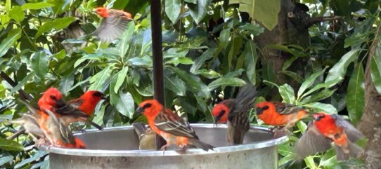 ▲ Apart from bats there are no native mammals but the birds are certainly colourful. These are red fody, also known as Madagascar fody, at a bird feeder in the Constance Lemuria Resort on Praslin Island. I did spot a tenrec, like an over-sized furry rodent, at the Vallée de Mai, but they are not native to the Seychelles.